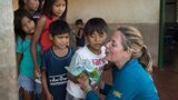 Fabiana Schleder Ruiz, Global Marketing Manager na Dentsply Sirona distribui kits de limpeza de dentes para o povo nativo. (Fotografia: Dentsply Sirona)