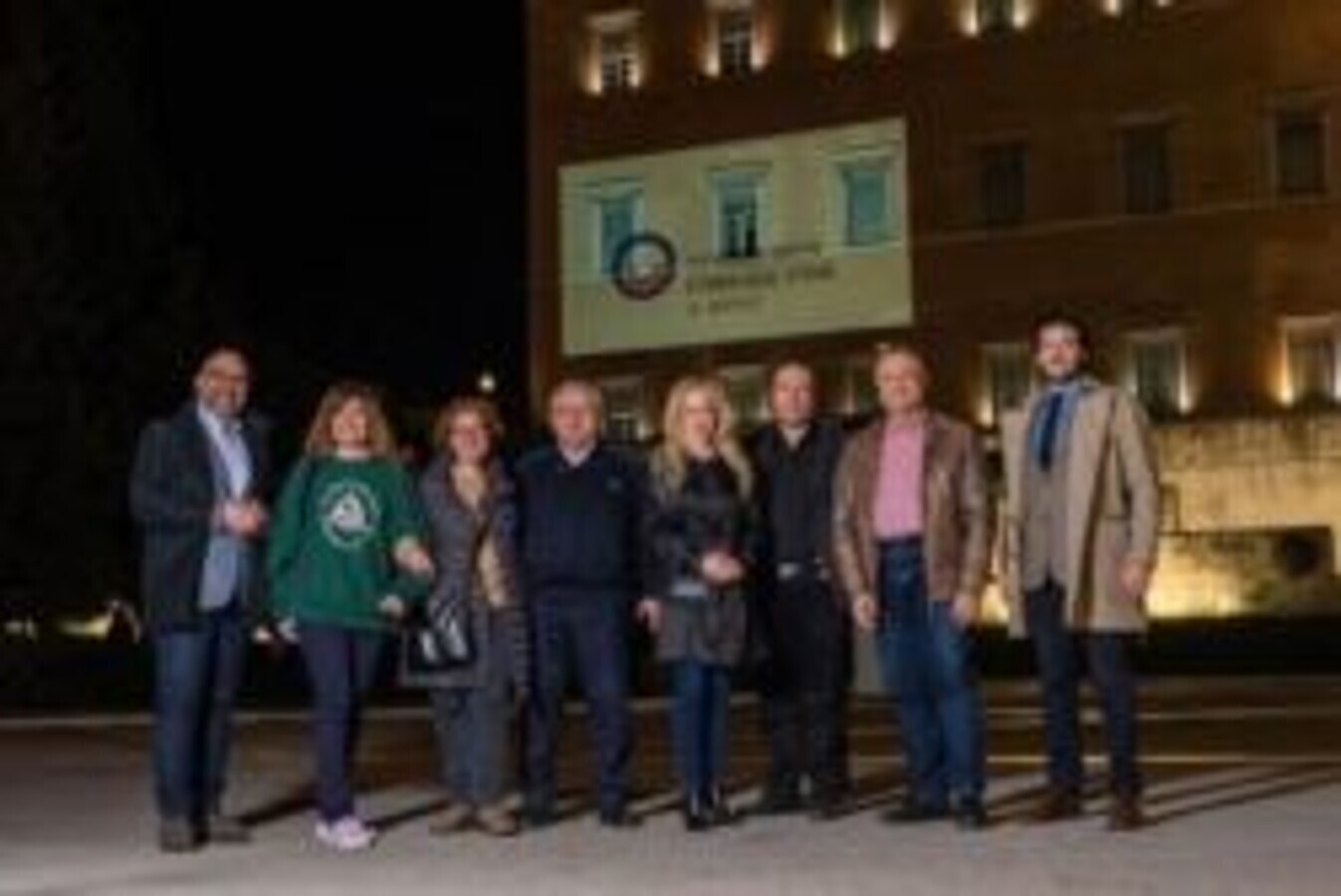 Membros da Associação Dentária Helênica posam em frente ao logotipo do Dia Mundial da Saúde Oral projetado no prédio do Parlamento Helênico em 2020. (Imagem: Hellenic Dental Association)