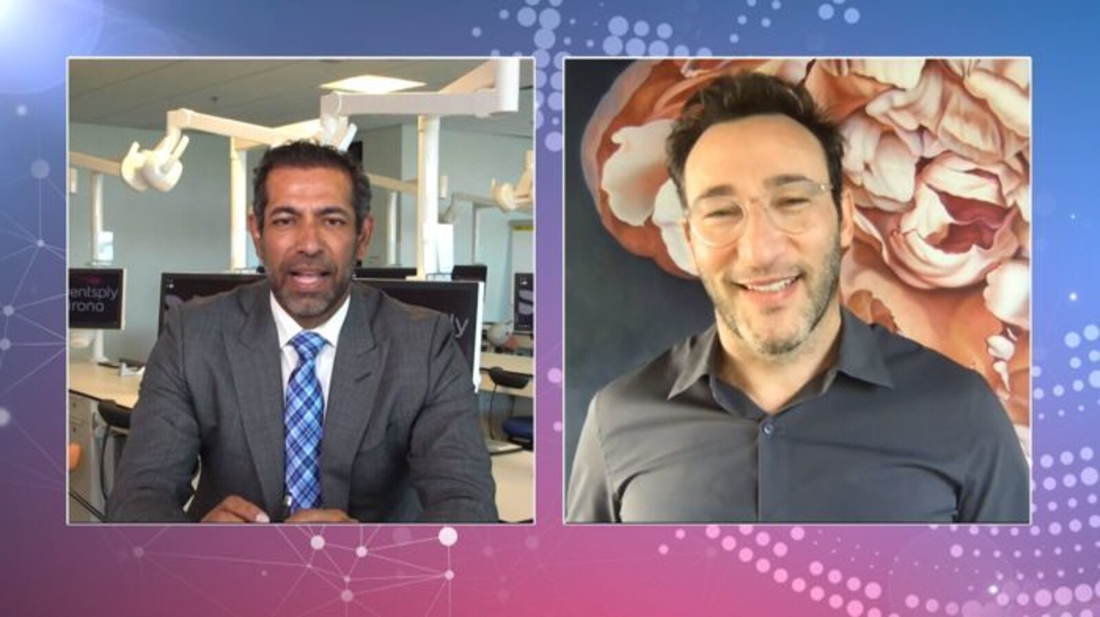 Em uma conversa sobre liderança: Dr. Sameer Puri, vice-presidente de educação clínica da CDOCS na Dentsply Sirona (à esquerda), e palestrante e autor de renome mundial Simon Sinek. (Imagem: Dentsply Sirona)
