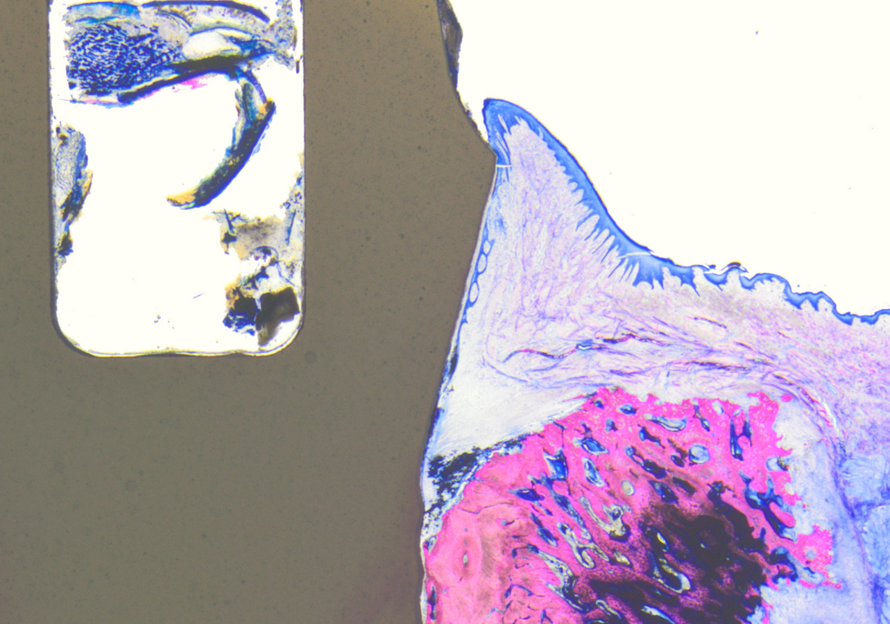 Histologia de um implante patenteado (esquerda) quatro semanas após a inserção; graças à adesão do tecido mole à superfície transmucosa do implante (círculo vermelho), nenhuma placa é visível abaixo do nível do tecido mole. (Imagem: Dr. Peter Schüpbach)